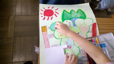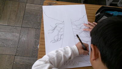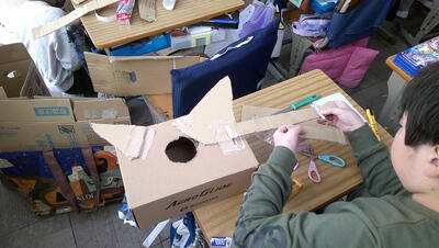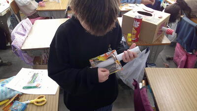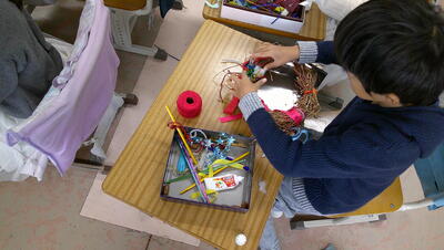 「みんなで オン ステージ」の単元で工作を行います。空き箱や輪ゴムを使って、弦楽器を作ります。今日は、そのイメージ図を作成します。