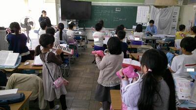 「やったー 100点」の曲で、正しいリコーダーの指使いを練習しています。
