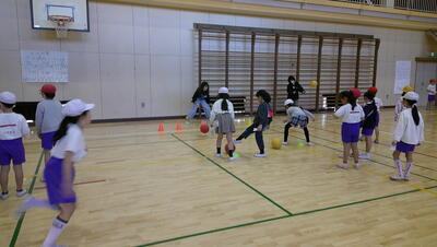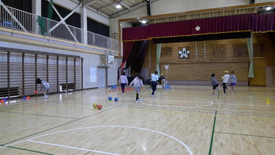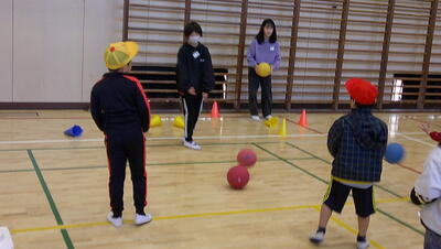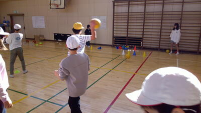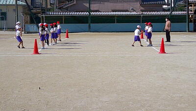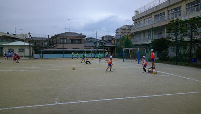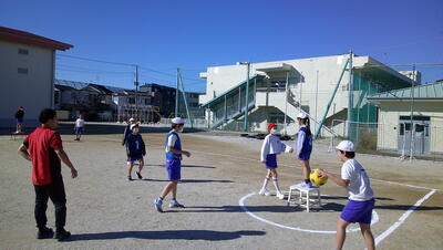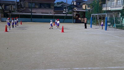 ゴール型 サッカーの活動をしています。低学年のボールゲームは、ゲームの楽しさに触れ、簡単なボール操作と簡単な攻めや守りの動きなどで、易しいゲームをすることをねらいとしています。
