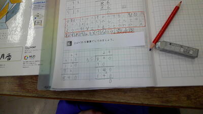 少人数指導の時間です。「1けたをかける かけ算のひっ算」について、どのように考えると答えが導き出せるか、まずは自分たちで考える時間を与えました。