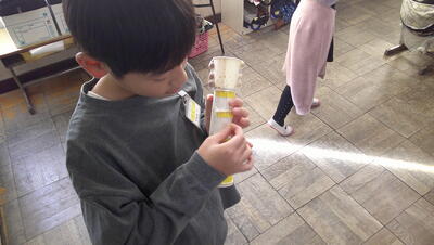 ものの溶け方の学習です。今日は、「溶けたものは、水溶液の中でどのようになっているのだろう」を学習のめあてに実験を行いました。仮説を、時間が経っても全体が茶色、時間が経てば下が茶色、と子供たちが立てました。その仮説を確認するために、今日の実験を行いました。