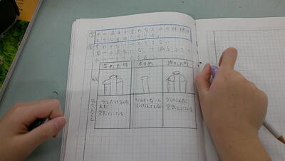 温度計と水が熱せられる様子を、細かく記録しながら観察をしていました。
