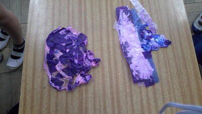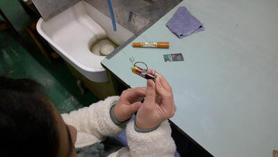 水加減に気を付けながら色の組み合わせや塗り方などを工夫して版画和紙に裏側から彩色をしています。