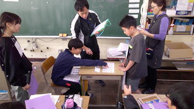 「左と右」「上と下」「外と内」といった分け方や組み合わせについてまなびました。チームで対決で「土」が付く漢字をたくさん見つける活動では、各チーム力を合わせて、習った漢字を振り返って必死に探していました。