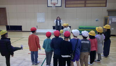 給食の時間です。栄養士は毎日、全クラスを回って献立の説明をしたり、あかべえ体操の指導をしてくれています。