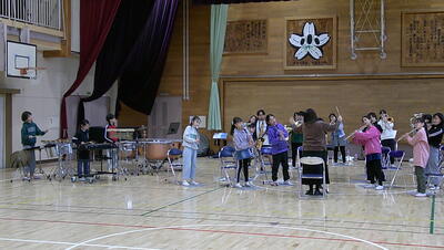 「山のポルカ」の演奏練習しています。いろいろな楽器を使って、リズム打ちの練習です。