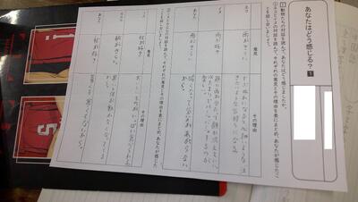 自分の成長を感じたできごとを思い出し、書くことを決めます。まずは、教科書の参考作文を読みました。