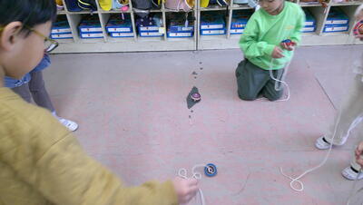 平につり合うときの左右のおもりの重さと支点からの距離を調べ、てこがつり合うときのきまりを発見するのも学びの面白さです。