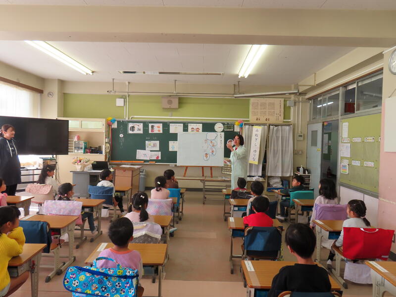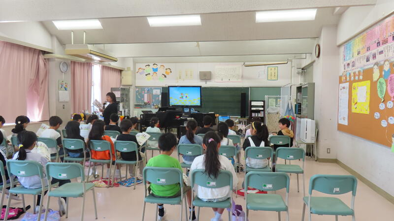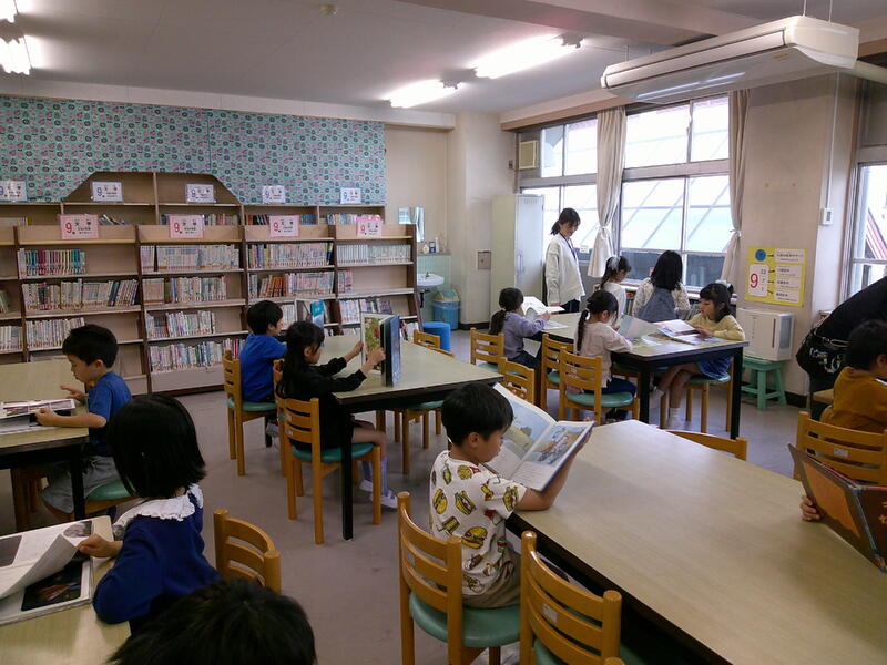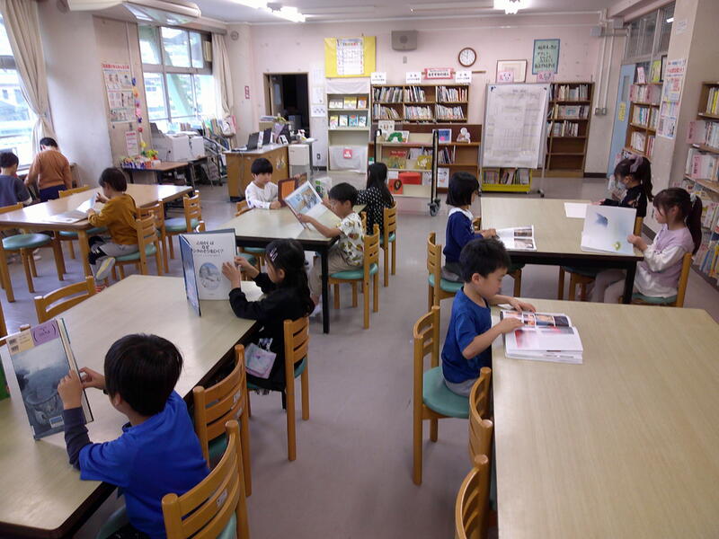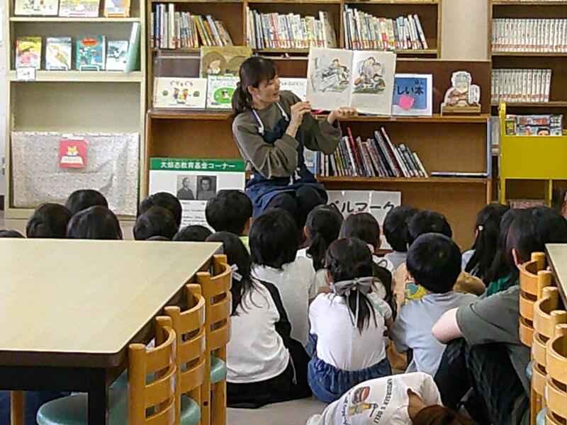 学校司書館員の先生が読み聞かせをしてくれています。図書室のオリエンテーションも兼ねて、外国の本、日本の本、昔ばなしと読み聞かせをしています。今回は外国語の本と昔ばなしの本を紹介していました。その本は何類にあるのか、その場所も教えながら行っています。子供たちも、その場所に行って本を手に取り、気になった本を借りています。今年度は、さらに読書教育を推進してまいります。