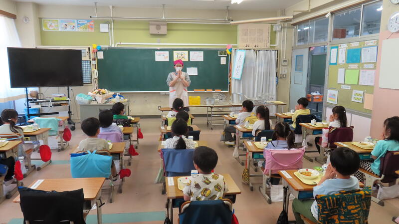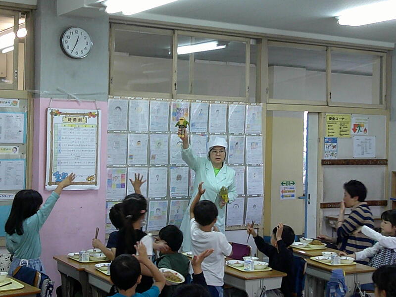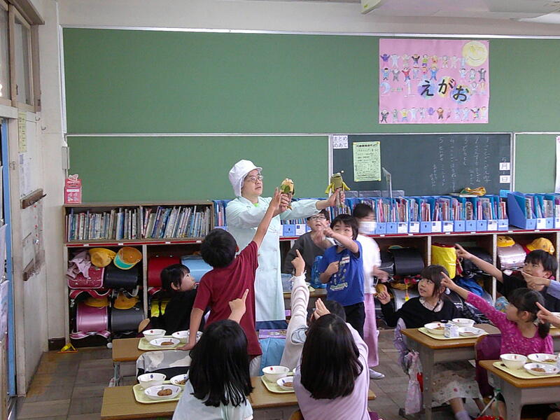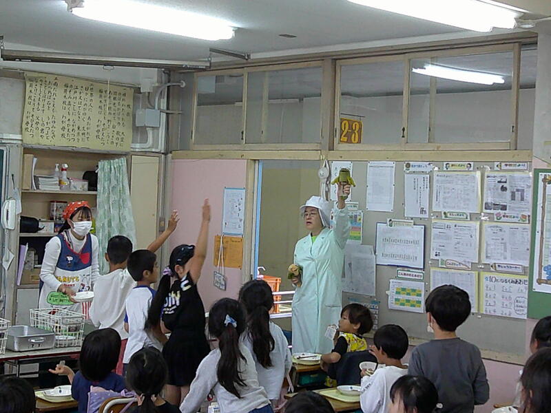 子供たちが楽しくモリモリ食べてほしいという願いと食育を兼ねて栄養教諭が、給食準備中に毎日、全教室を回って声掛けをしています。今日は、「がまくんはどっち?」クイズを出題していました。