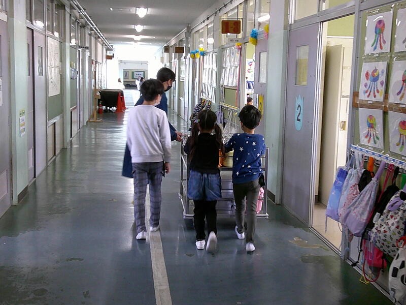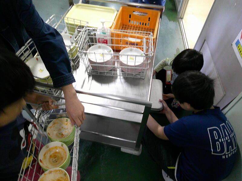 学校給食2日目、給食当番は大きめの割烹着を着て、お友達が持っているお盆に、おかずやご飯、牛乳等を置く仕事をしています。