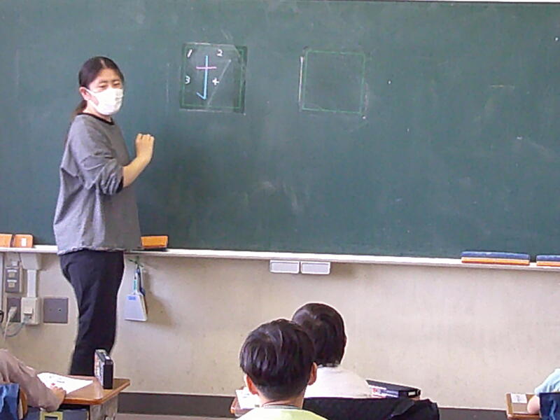 ひらがな「お」の書き方を指導するのに、一マスを4つのお部屋に区切って練習します。そうすることで、書き順や字形を意識することができます。