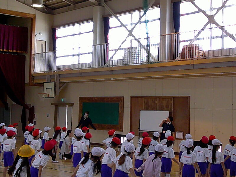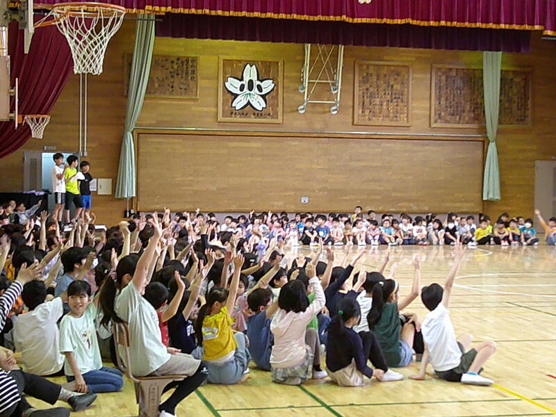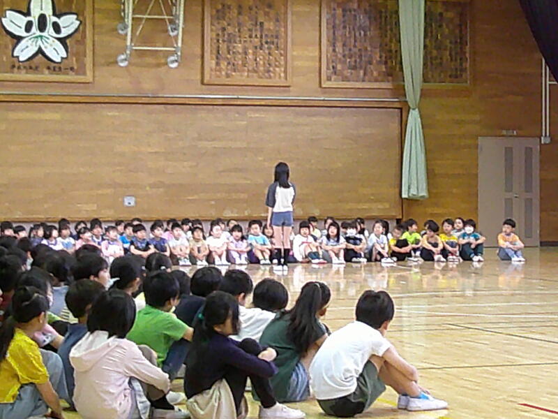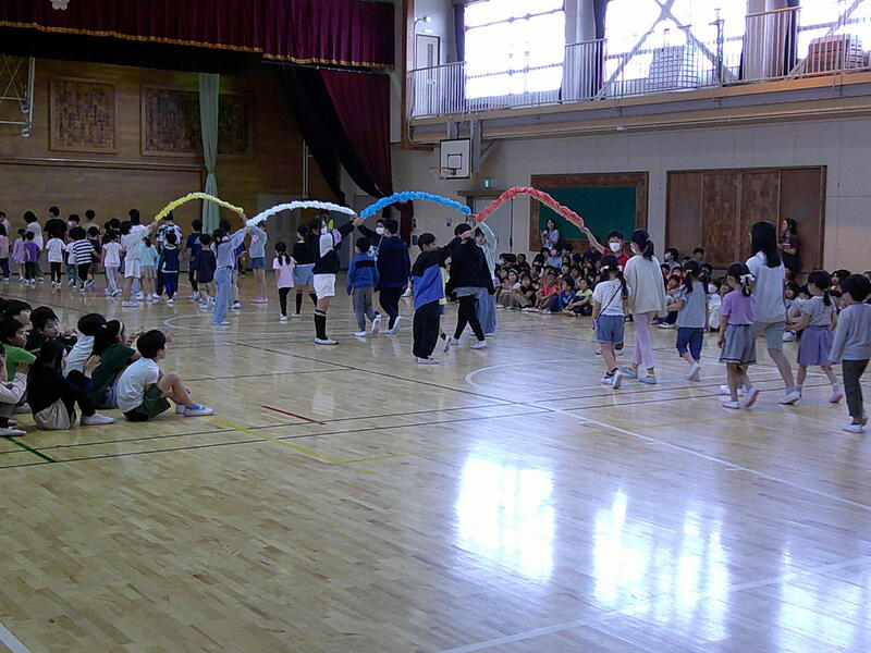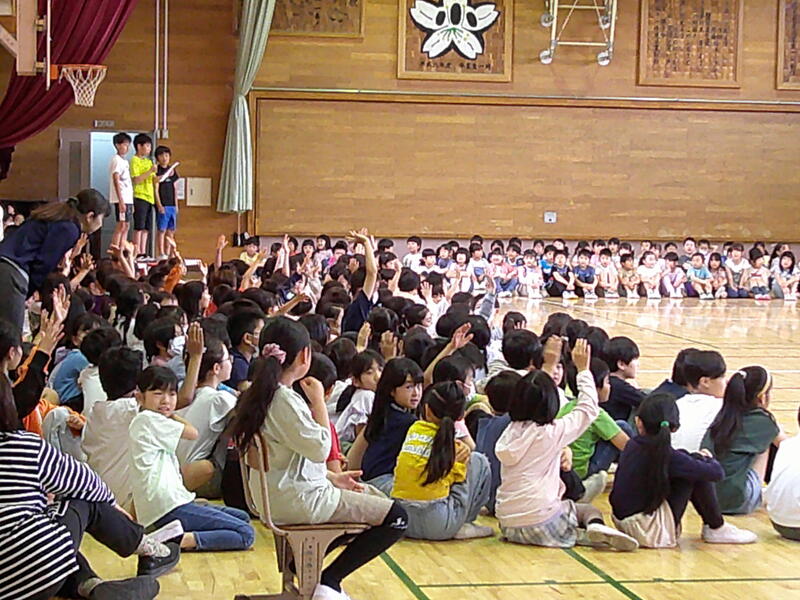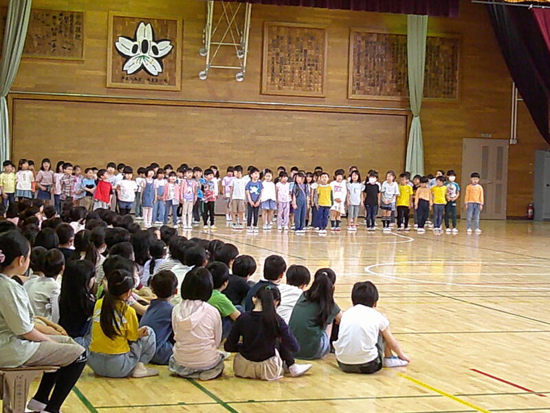 そして、1年生へのプレゼントの紹介です。2年生から6年生で協力して背の高さを測ることができる、「のびのびきりん」を作りました。そのお礼に、1年生から歌のプレゼントがありました。