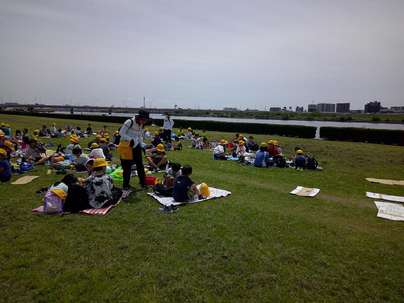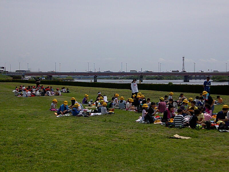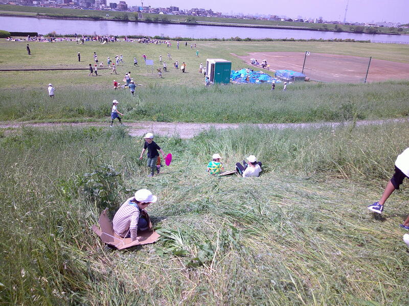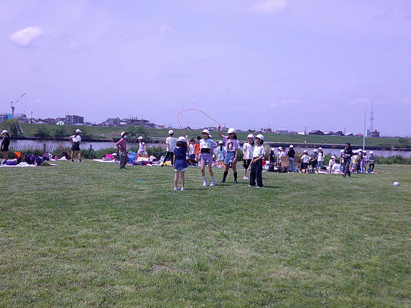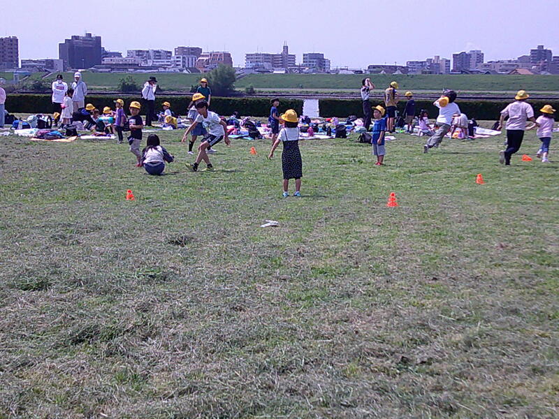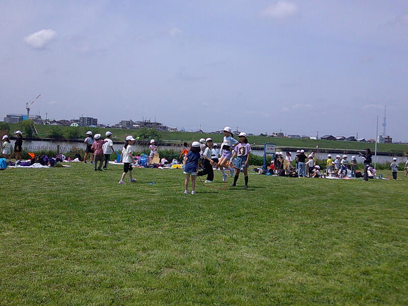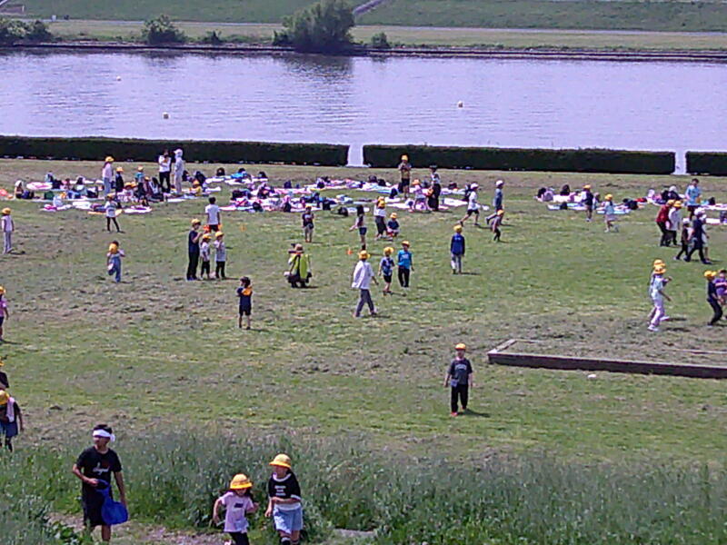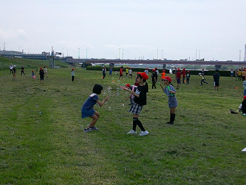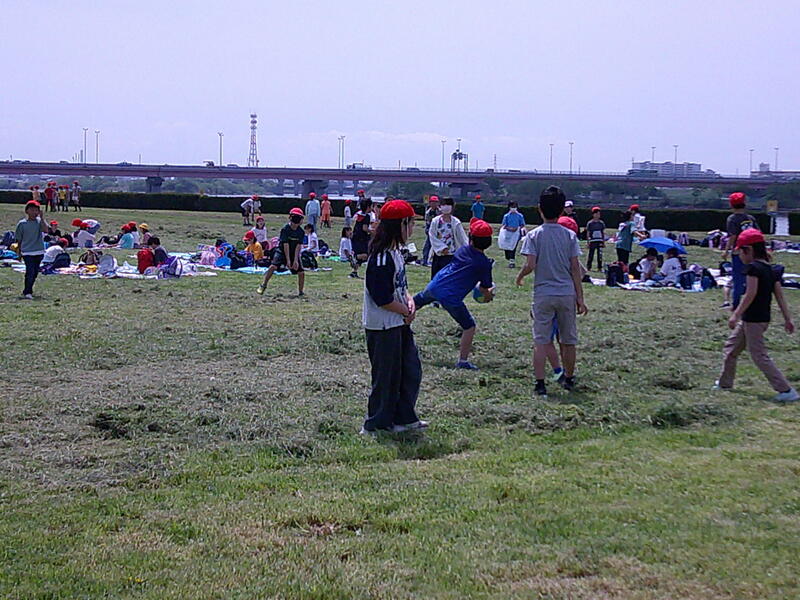 江戸川の河川敷に到着です。各々遊び道具を準備してきた子供たちは、あっという間に広がって、仲良しグループと遊び始めました。