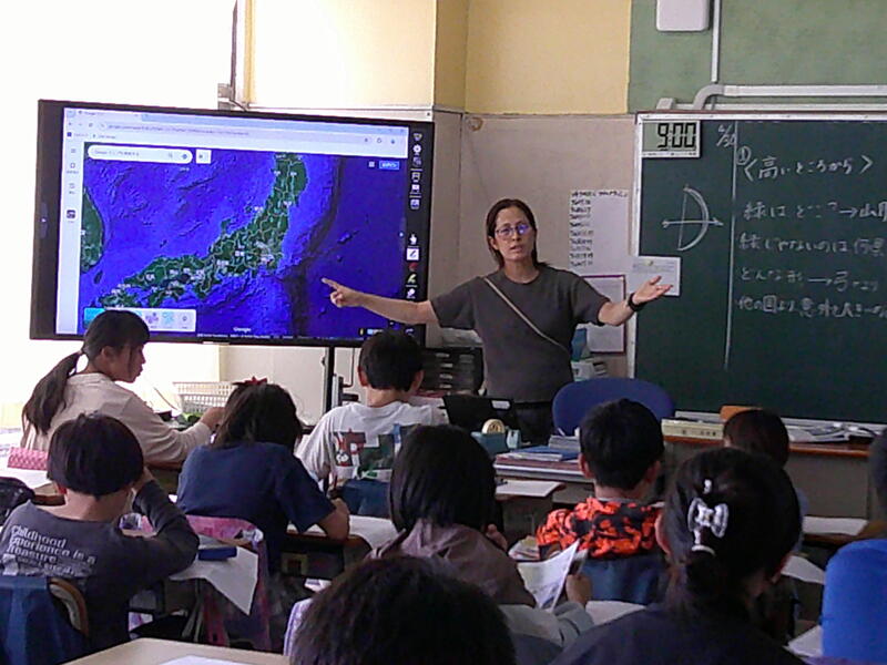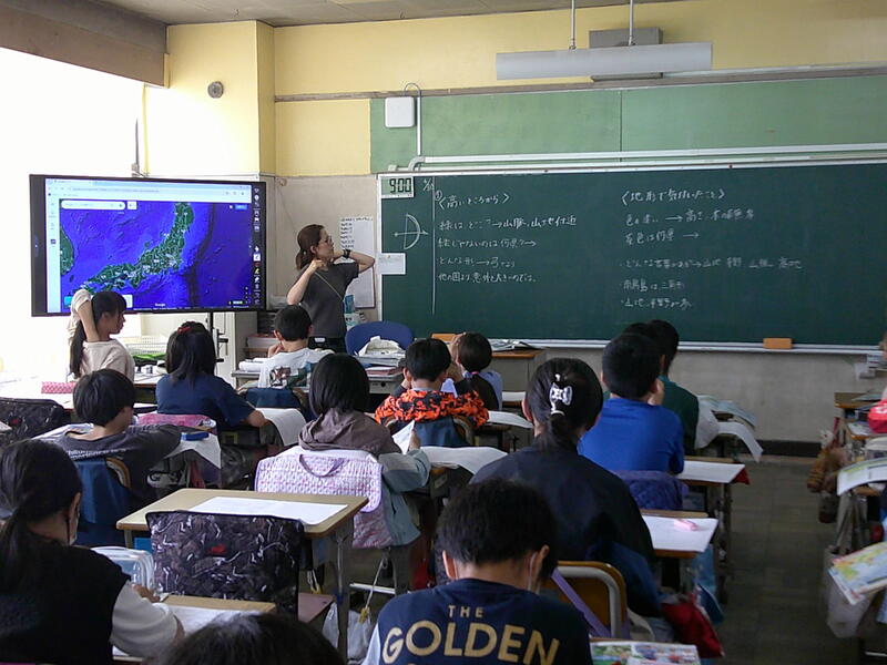 高い土地の特徴を調べるための課題設定のところです。今後、主体的な調べ学習ができるよう、日本の国土の形や色の違いから、気づいたことを話し合っています。
