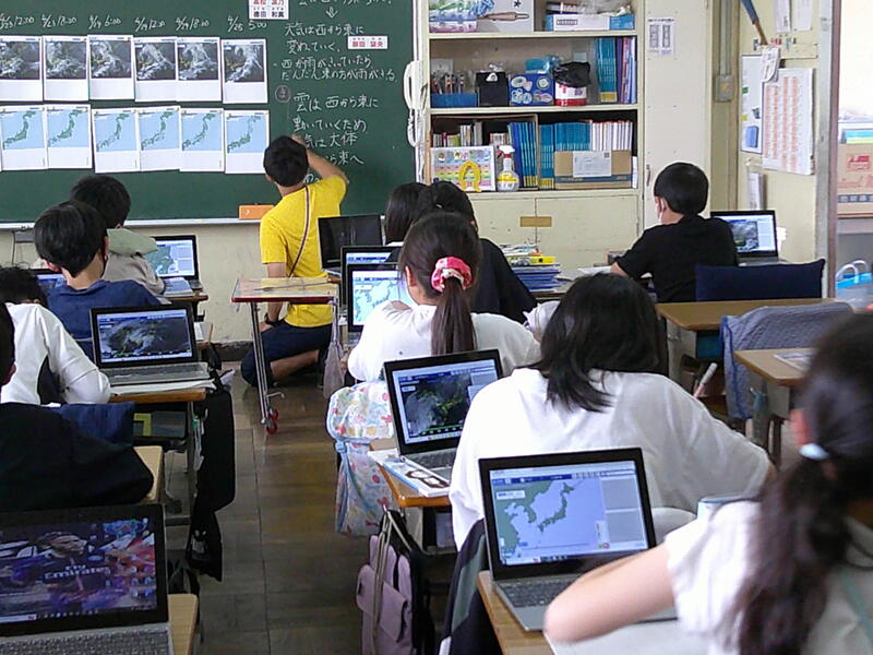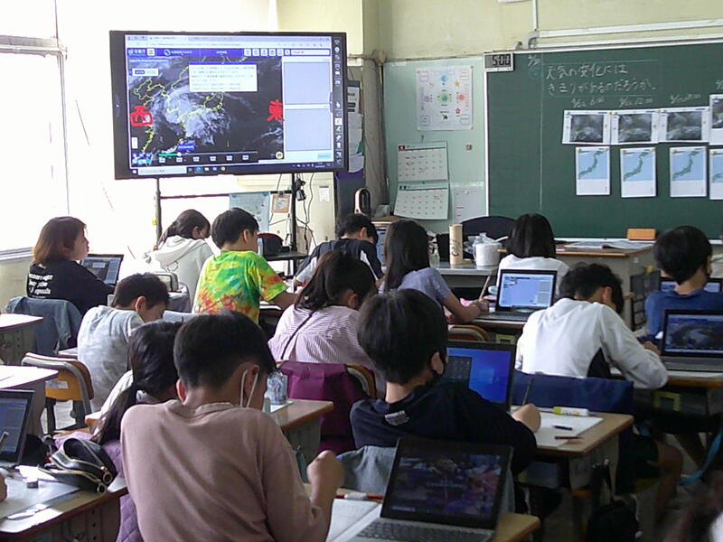 天気の変化には決まりがあるのか、10日分の天気図を活用して雲の動きを追いました。考察から天気は西から東に変わっていくことに気づき、雨が西で降っていたら、その雨雲は東に移りやがて雨が降ることがわかりました。