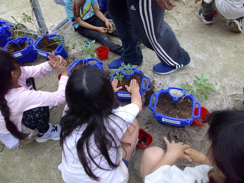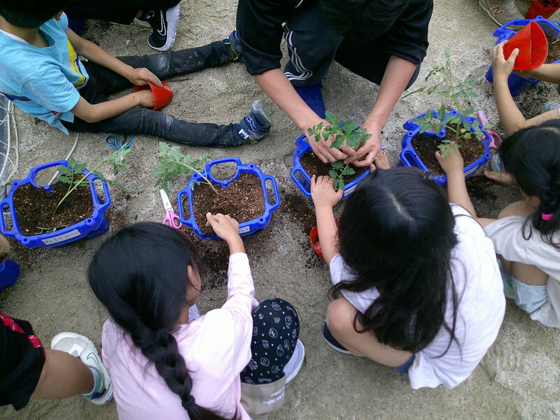 トマトの苗を植えました。収穫まで大切に育てていきましょう。