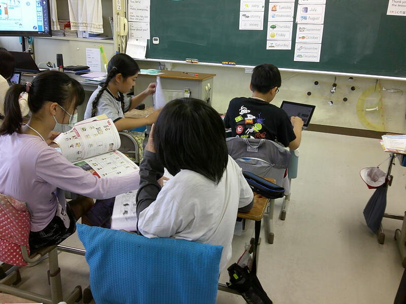 わからない単語は、タブレットを活用して調べ、セリフの文章が完成した子は友達同士で練習しています。