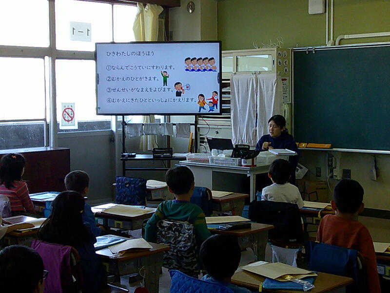 本日、引き渡し訓練を行いました。全校、パワーポイントを用いて担任が防災について指導しました。