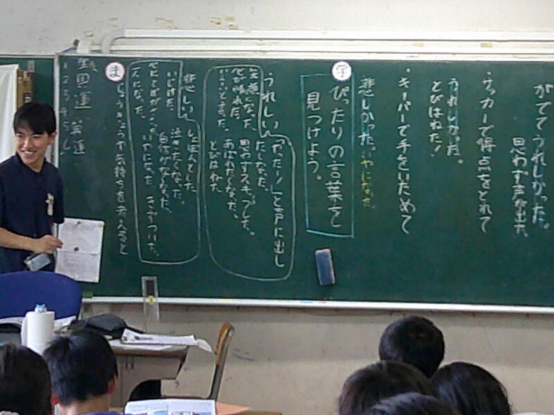 その時にぴったりと合う言葉を、身近な場面を想定して文章を考えました。例えば、タイピングで最高記録がでて、うれしかった。→思わず声をだす。と表現をより具体化していました。振り返りでは、その時の状況で気持ちを考えるとぴったりの言葉を見つけることができると伝え合っていました。