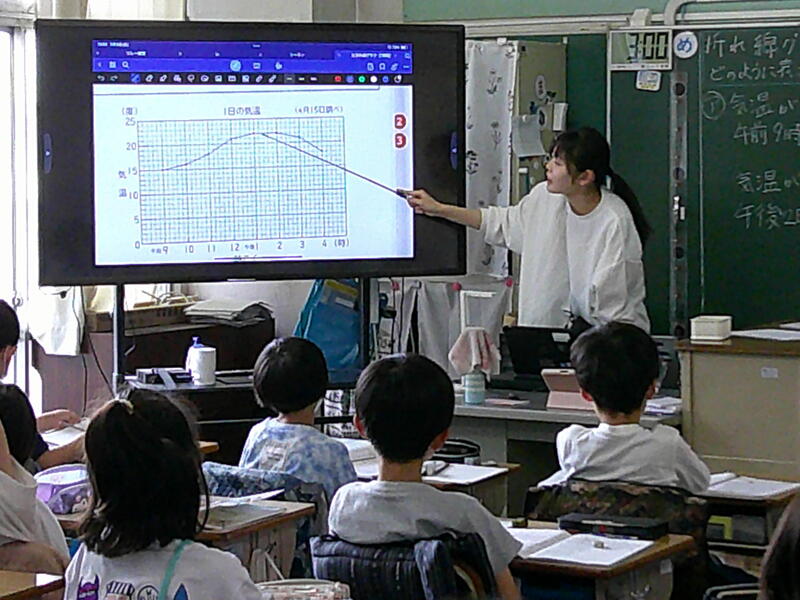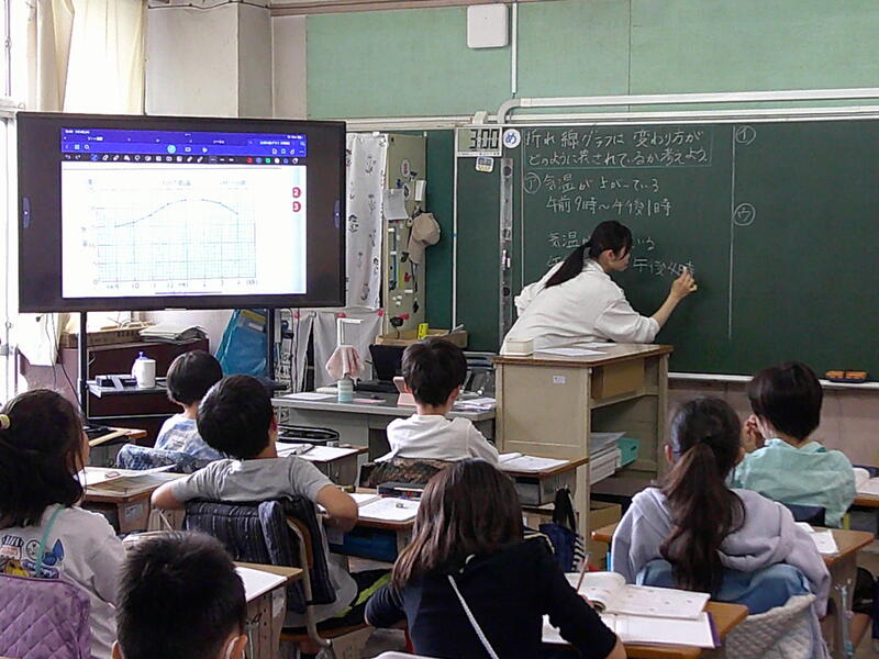 気温が上がった時間帯、気温が下がった時間帯はグラフがどんな状態になっているのか、確認できました。今後、社会の資料や理科の実験等の考察、身近な生活に活用できることが大切です。