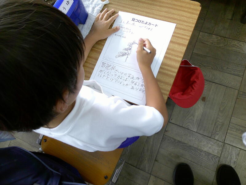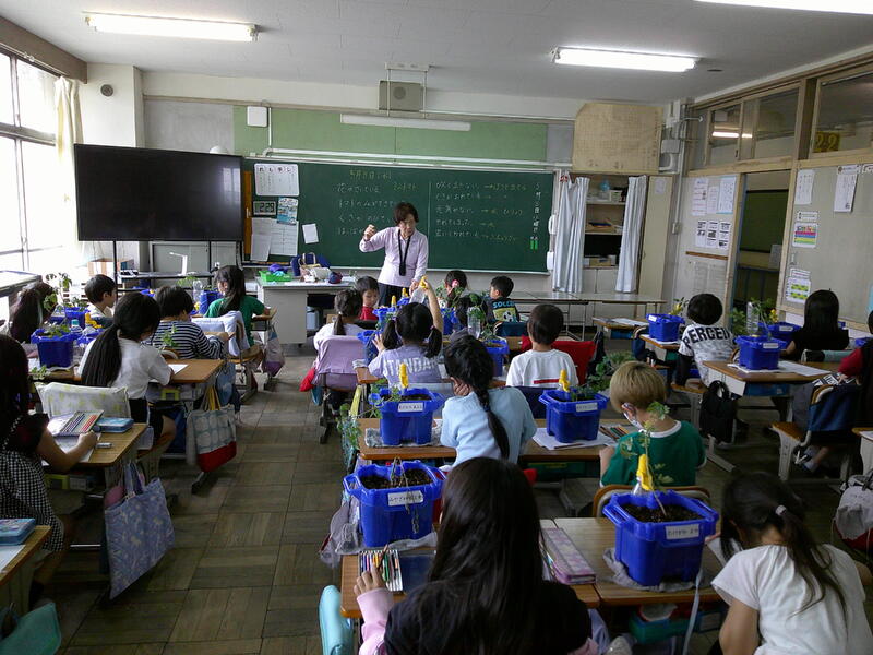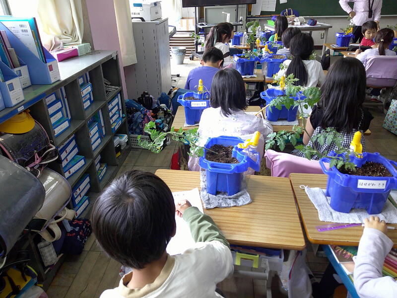 連休前に植えた苗が、ずいぶん成長していました。「茎が伸びた苗、倒れかかっているけれど、どうすればいいだろう?」「元気がないけど、どうしよう?」「虫に食われているけど、大丈夫かな?」と自分の育てている苗を見て気づいたことを発表しました。