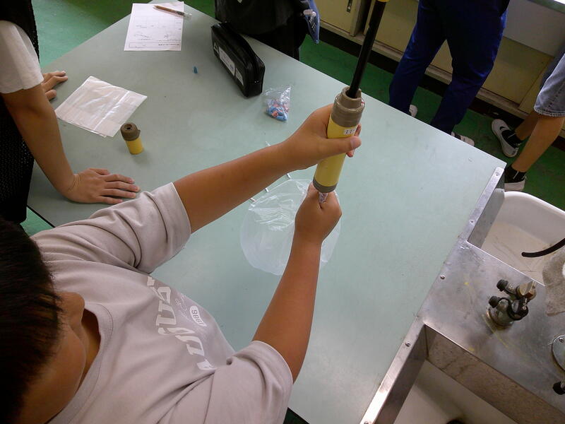 吸ったり、吐いたりしたビニール袋、石灰水を入れて
