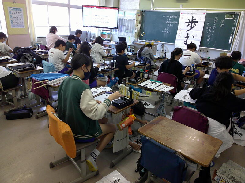 慌ただしい中でも、文字に集中する毛筆に取り組んでいます。文字の大きさと配列を意識して「歩む」という文字を書いています。