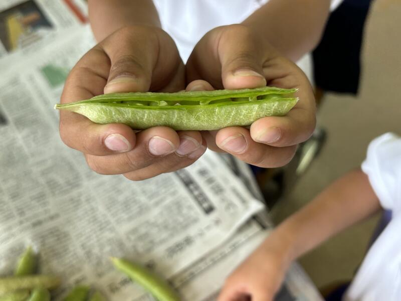 本日の給食でグリンピースご飯がでました。昨日、1年生の子供たちが、グリンピースのさやむきをしました。