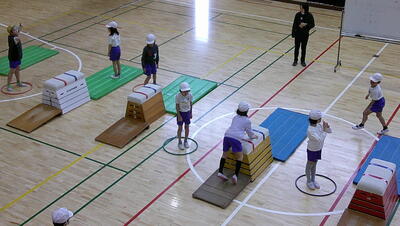 また、跳び箱運動では、「踏切り-着手-着地」までの動きが身に付くようにしていくことが大切です。一連の動きや感覚を言語化(合言葉化)し、友達の口伴奏に合わせて運動に取り組むなど、友達と声をかけ合い、楽しみながら技の学習を進めています。