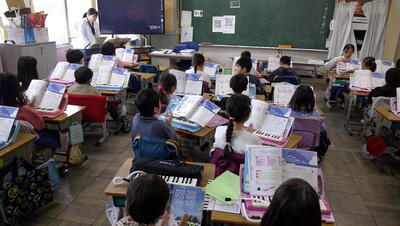 「やったー 100点」の曲で、正しいリコーダーの指使いを練習しています。