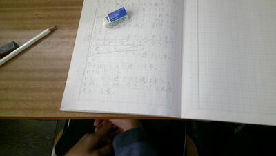 自分の成長を感じたできごとを思い出し、書くことを決めます。まずは、教科書の参考作文を読みました。