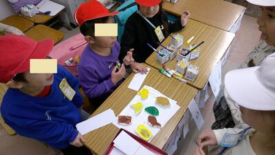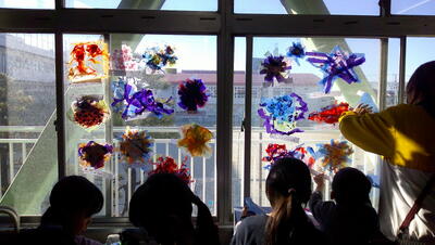 「のりのり おはながみで」といいう単元で、ちがう形や色のお花紙を重ねると、どんなかんじになるか、重ね方を工夫してきれいな飾りを作りました。