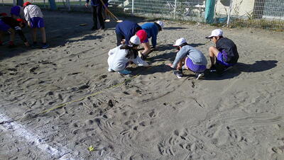 走り幅跳びに取り組んでいます。動きのポイントである「リズミカルな助走」「力強い踏み切り」を、試しながら見付けています。そして、見付けた動きのポイントが身に付いたかどうかを見合ったり、距離を測り合ったりと、関わりながら学習をしています。