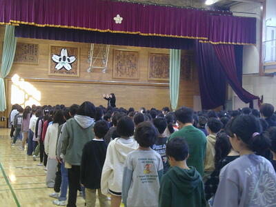 今日は風がない分、温かさを感じる朝でしたが、登校してきた子供たちは日向を探して昇降口が開くのを待っていました。また、本日業間休みに、「なしの実ボランティア」の方々がイベントを開いてくださいました。