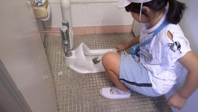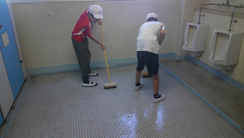 【男子トイレです。たわしで、床のタイルをしっかり洗っています】