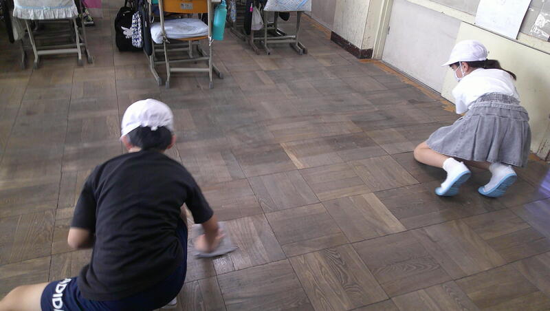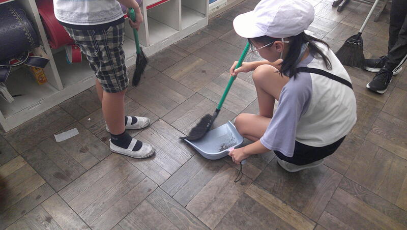 【教室掃除です。隅々まできれいに掃いて、きれいに拭き掃除ができます。】