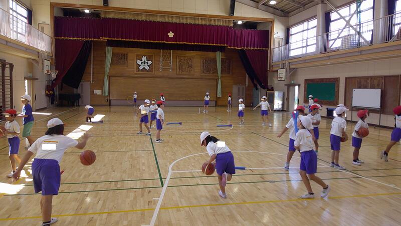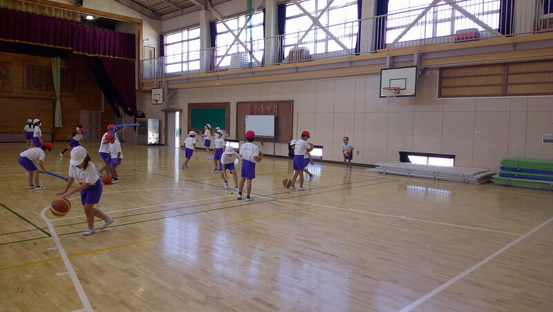体育館で思いっきり、体を動かしています。連日、暑さ指数が31以上になり、遊びも運動も制限されてしまいます。体育館は、暑さ指数が28で運動ができる指数です。のびのびと一人一人体を動かしています。