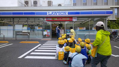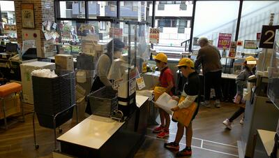 社会科の学習で、お店見学に出かけました。学年を4グループに分けて、1つのお店をしっかり調べてくる活動です。