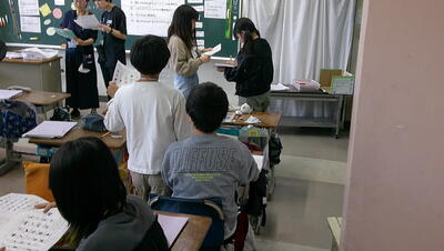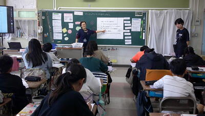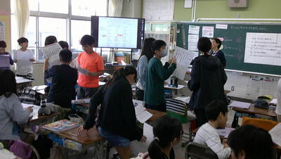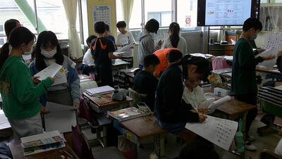 英会話でオリジナルサンドイッチについて伝え合う活動説明を外国語指導員から聞きました。内容を聞いて、子供たちはやる気満々です。このような場をたくさん経験して、中学校に上がってほしい思っています。