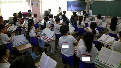 「山のポルカ」の演奏練習しています。いろいろな楽器を使って、リズム打ちの練習です。