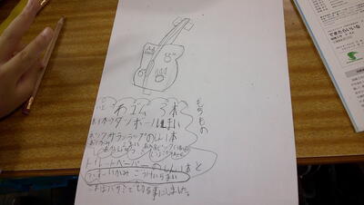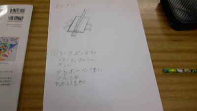 「みんなで オン ステージ」の単元で工作を行います。空き箱や輪ゴムを使って、弦楽器を作ります。今日は、そのイメージ図を作成します。