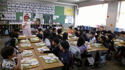 給食の時間です。栄養士は毎日、全クラスを回って献立の説明をしたり、あかべえ体操の指導をしてくれています。