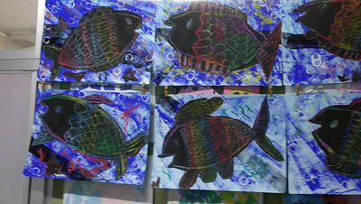 「にじいろのさかな」が完成しました。一人一人個性ある作品で、どれも力作です。