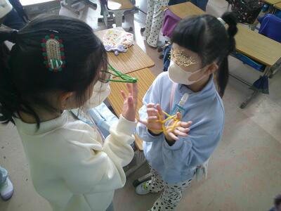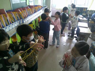 昔遊びのあやとりを行っていました。どの子も、いろいろなあやとりの技ができるようになっていました。
