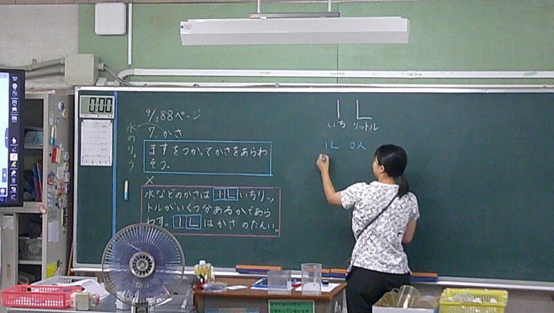 「かさ」の学習をしています。ますを使ってかさをあらわすのに、水などのかさは、1Lがいくつ分あるのかを押さえました。そして、実際にバケツに入っている水の量を調べてみました。