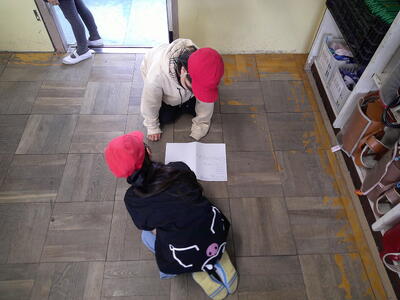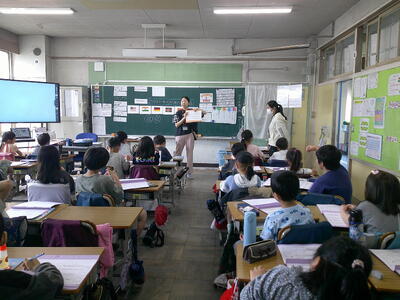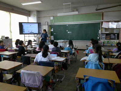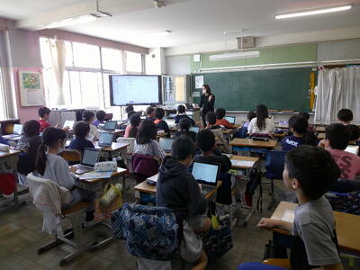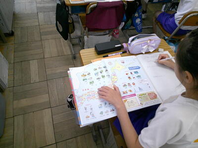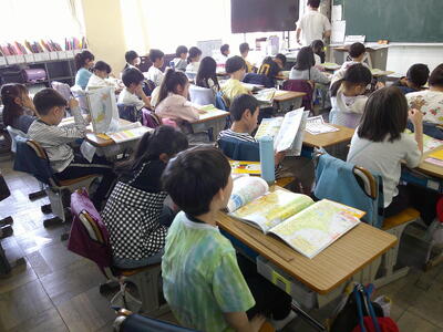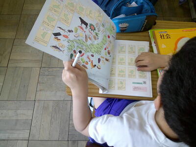 市川市の学習をしています。チーバくんの形で市川市はどこか、地図帳を見ながら確認しています。