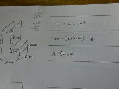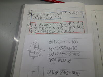 子供たちの考え方には、既習事項である直方体や立方体の体積の求め方を生かして考えることができています。また、四年生で学習した複合図形の面積の求め方を想起した考え方も重要なポイントです。