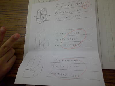 少人数に分かれて、体積の学習です。直方体の体積の公式が使えるように工夫して考えることが、本寺のめあてです。