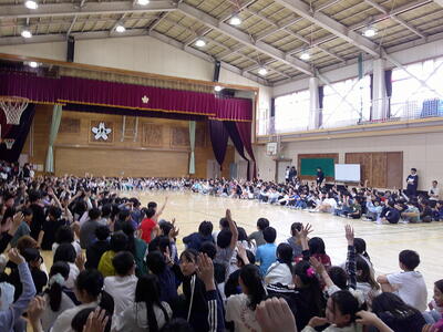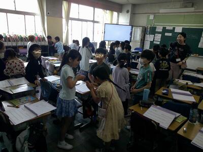 インドのあいさつ「ナマステ」を友達同士交わして、ベルが鳴った相手とジャンケン、勝った人が2ポイント、負けた人が」1ポイントというゲームケー式で活動を行いました。